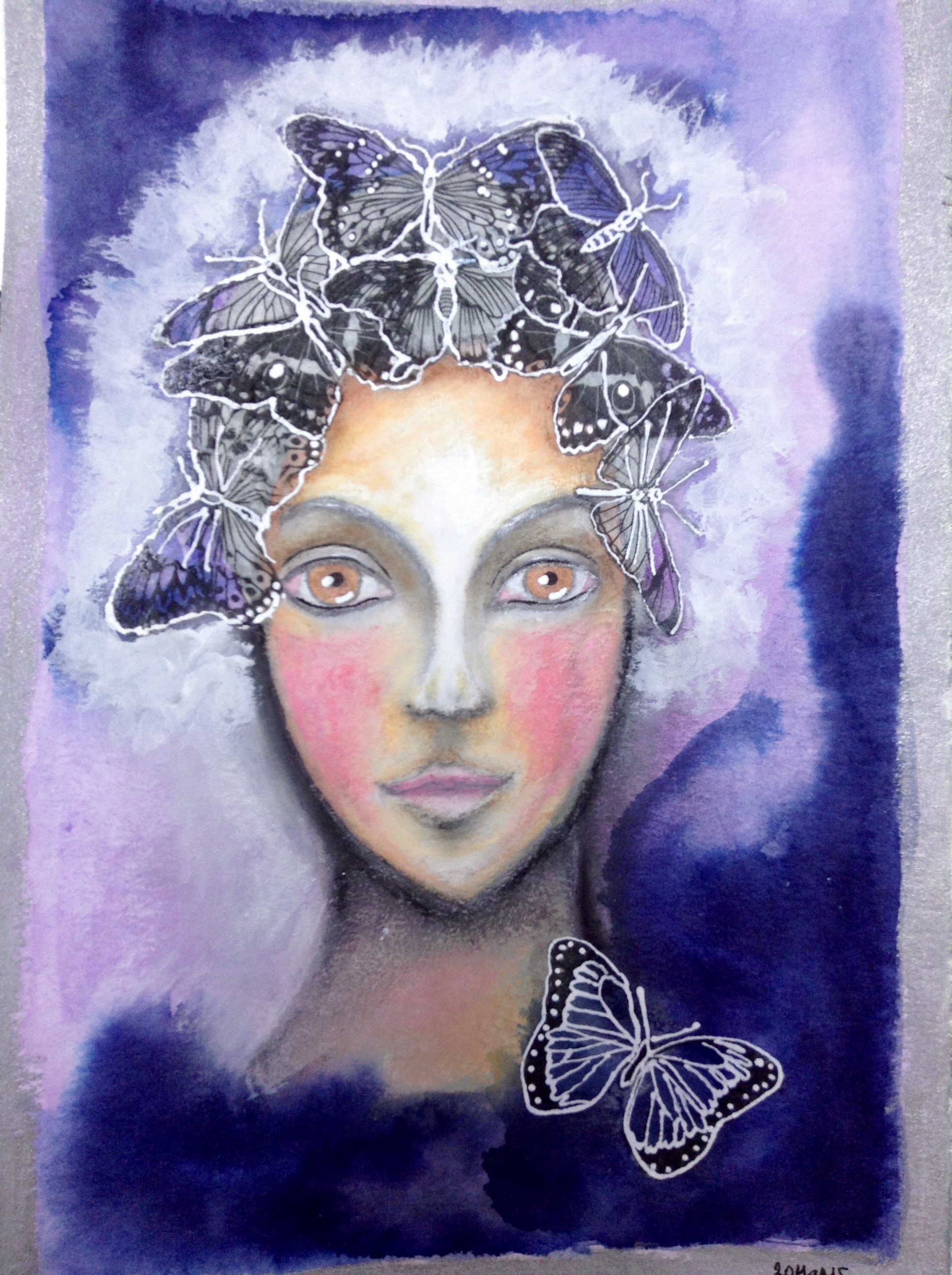 Face No. 2 I enjoyed – I discovered that I can use soft pastel on her face to achieve nice smooth blending. Here I used watercolour for the background and pasted butterflies that I cut out from a napkin and then went over it with white acrylics.