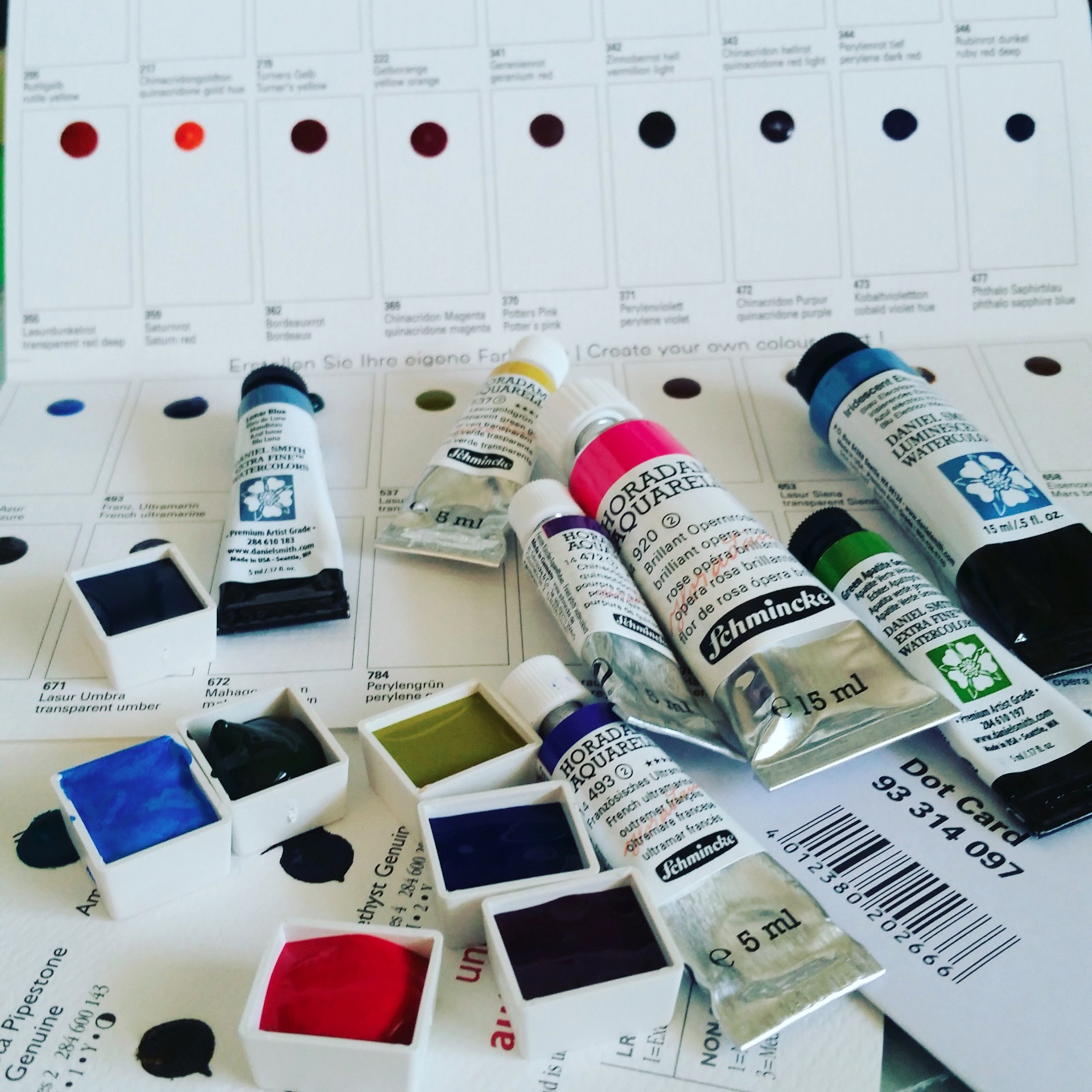 Some time ago I ordered several new watercolours, because Schmincke just recently introduced 36 new colors and I wanted to try some of them. Also they were giving a free dot chart to the first 100 orders in Jackson’s, so I thought it is a good idea to order now and get the dot chart, so I can try all the colors and decide which ones I absolutely must have… Along with Schmincke, I ordered some Daniel Smith too, three colors that I wanted for some time: