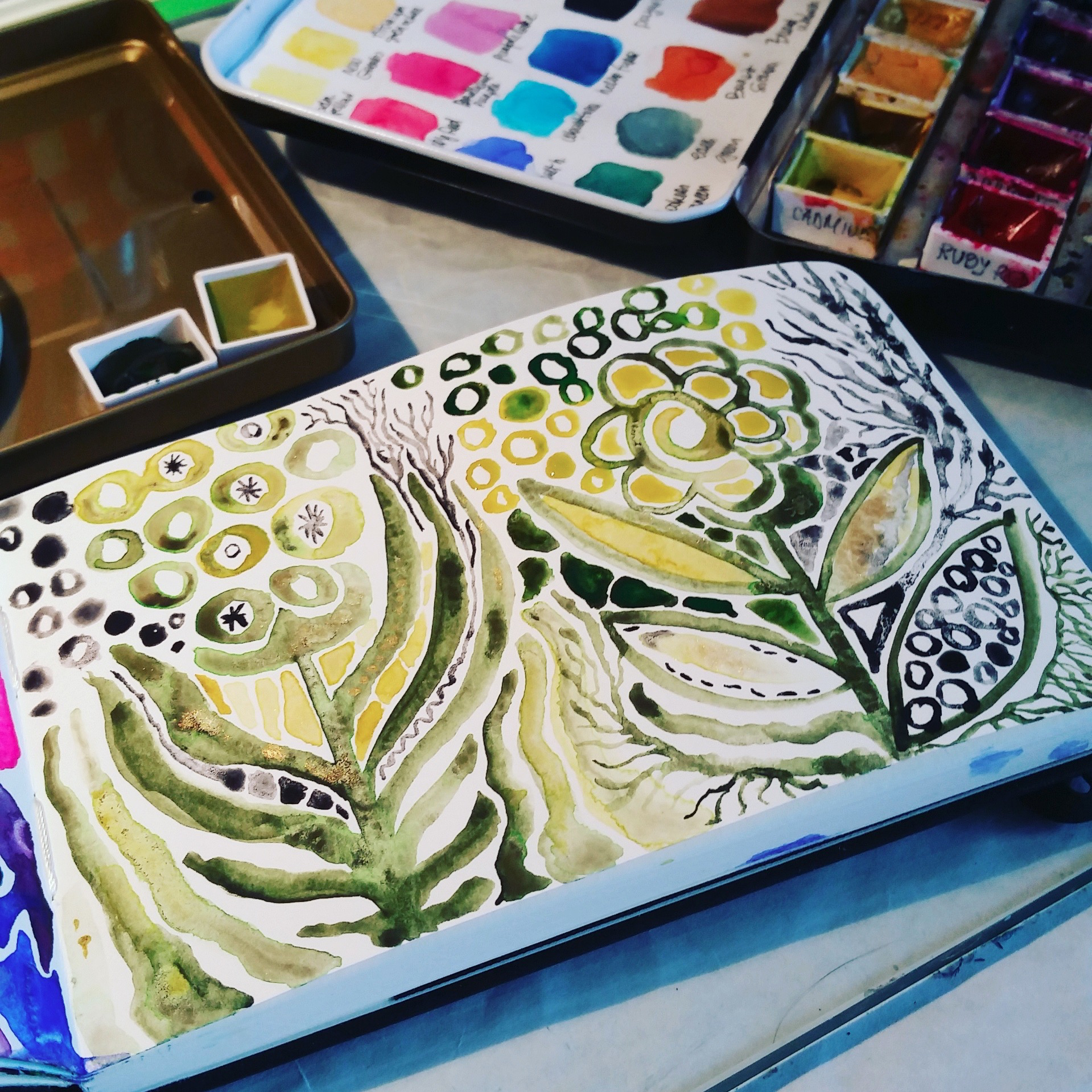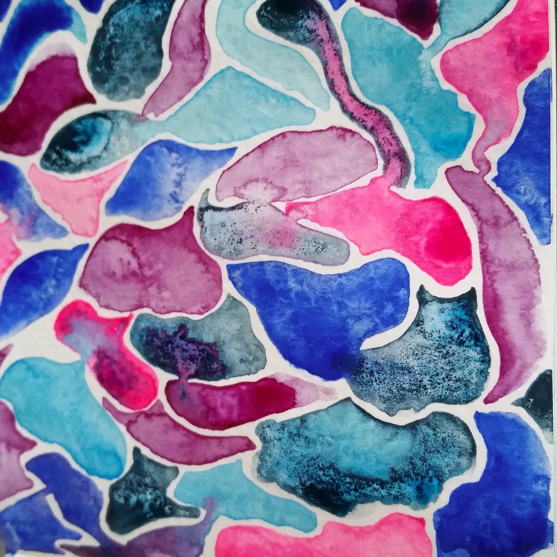 So, today and yesterday morning I was just making random doodles to try out the colors. I am happy with my choice, especially the Mars Blue and Green Apatite by Daniel Smith and French Ultramarine by Schmincke, which are all beautiful granulating paints. Also, I wanted that Opera Rose for a long time, and now I got a big tube (they did not have smaller) so there will be plenty of Opera pinkish paintings coming up. It will be great for my mandalas! Here are the two test doodle pages: