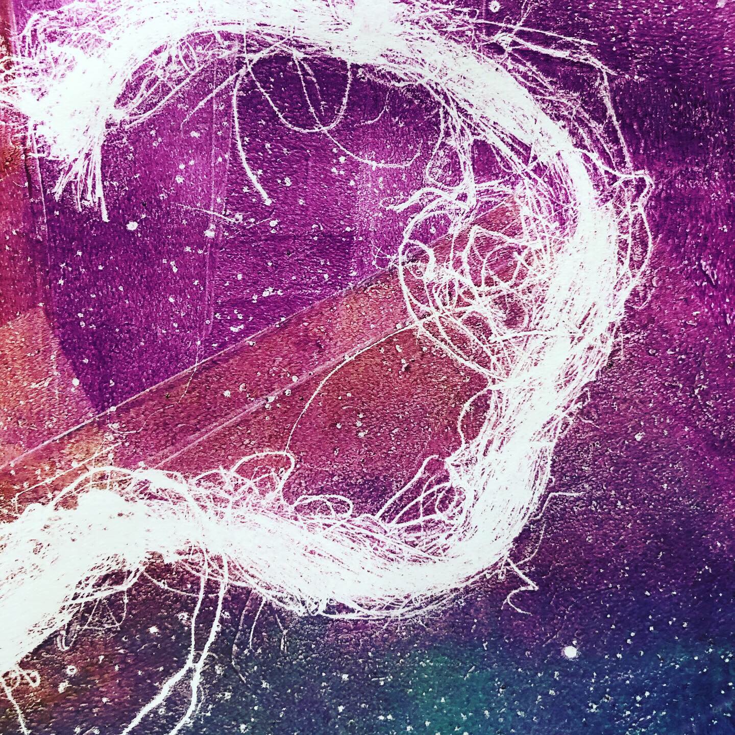 Experiment with yarn. Cool, but it stuck to my brayer and I took me half a day to unstuck everything… now I have a clean brayer too 😀