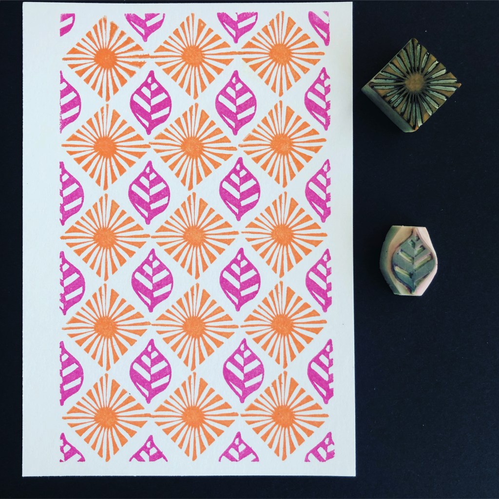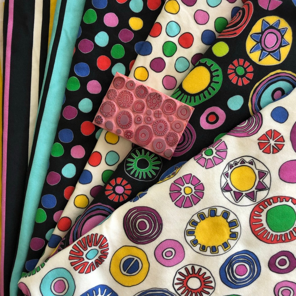 I ordered my new fabrics from Spoonflower. Here’s a photo of some of them – those that are based on one of the stamps I carved recently: