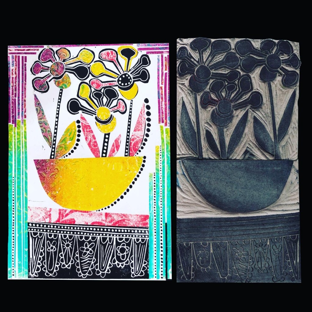 I did several Lino prints which mostly did not turn well. I tried new ink – Caligo safe wash. It did not improve my printing skills. In thinking what to do with so many misprints, I started making collages. Here’s what I did: