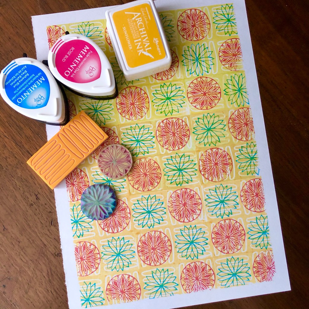 I am working on my 100 day challenge. I am on print number 19 today. I skipped two days this week, but still managed to do a decent number and even carved some new stamps. Here are the prints: