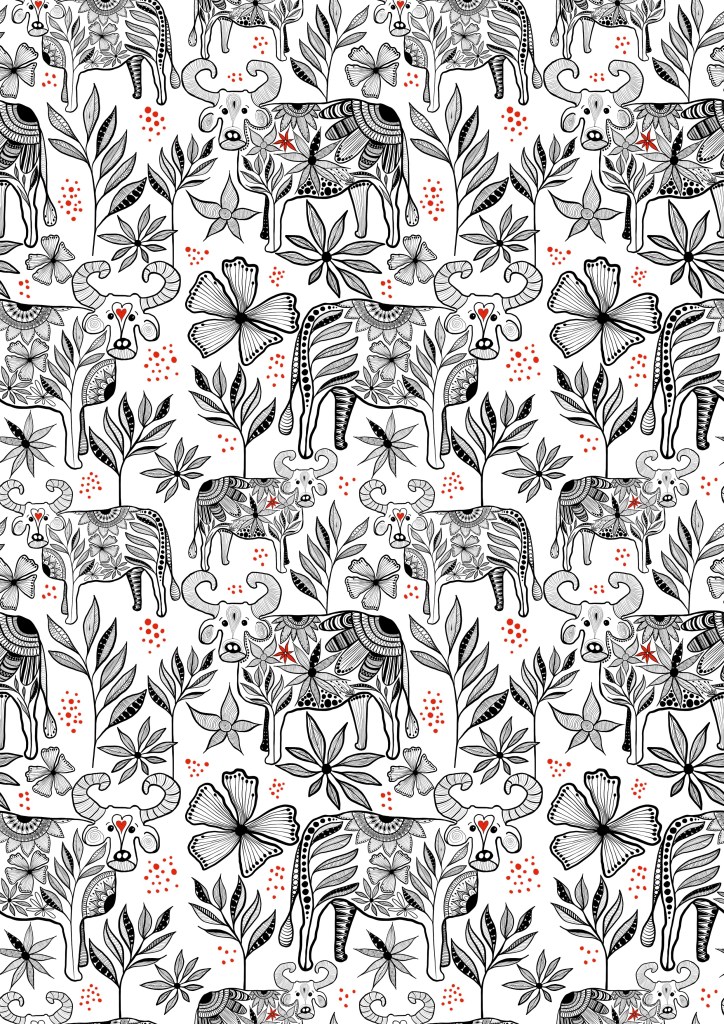 But I did make a nice pattern for this week’s Spoonflower challenge titled Year of the ox. I really surprised myself because I felt totally uninspired by the topic, but once I started drawing I started liking it to and I am really pleased with the result: