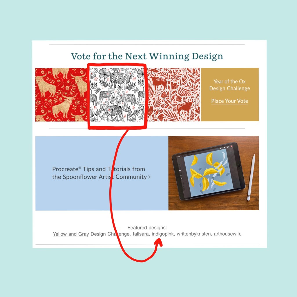 And then a complete surprise: my design got featured in Spoonflower newsletter: