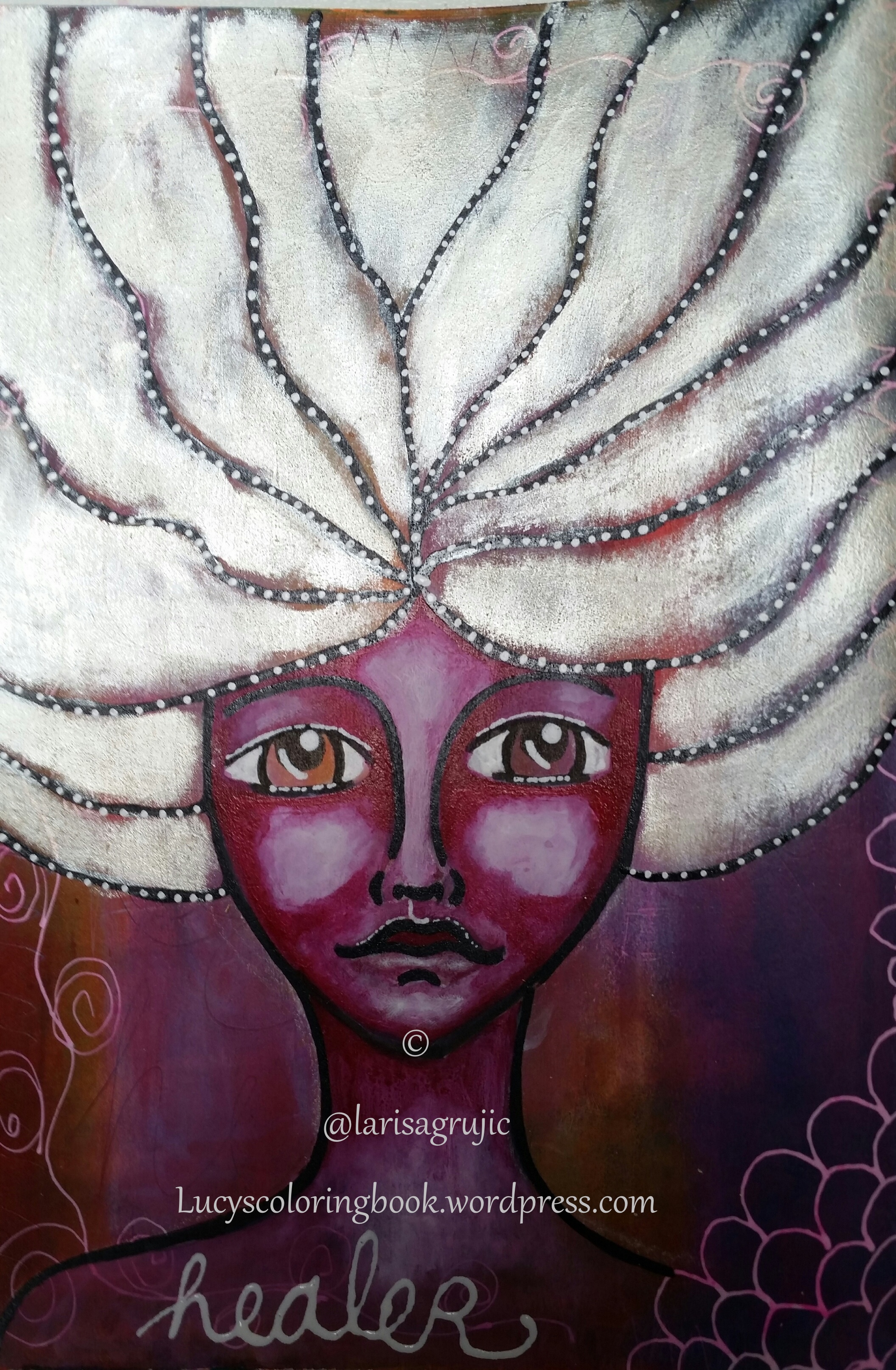 And the third one was all about learning to appreciate my inner artist and about never saying that I hate my work. She came out far from perfect so this was a great opportunity to practice loving her no matter what. I wrote my promise to her in her hair and then felt all teary and snivelling 🙂 Another discovery I made here is using iridescent medium to activate Neocolors, which made it all shimmery and girly.