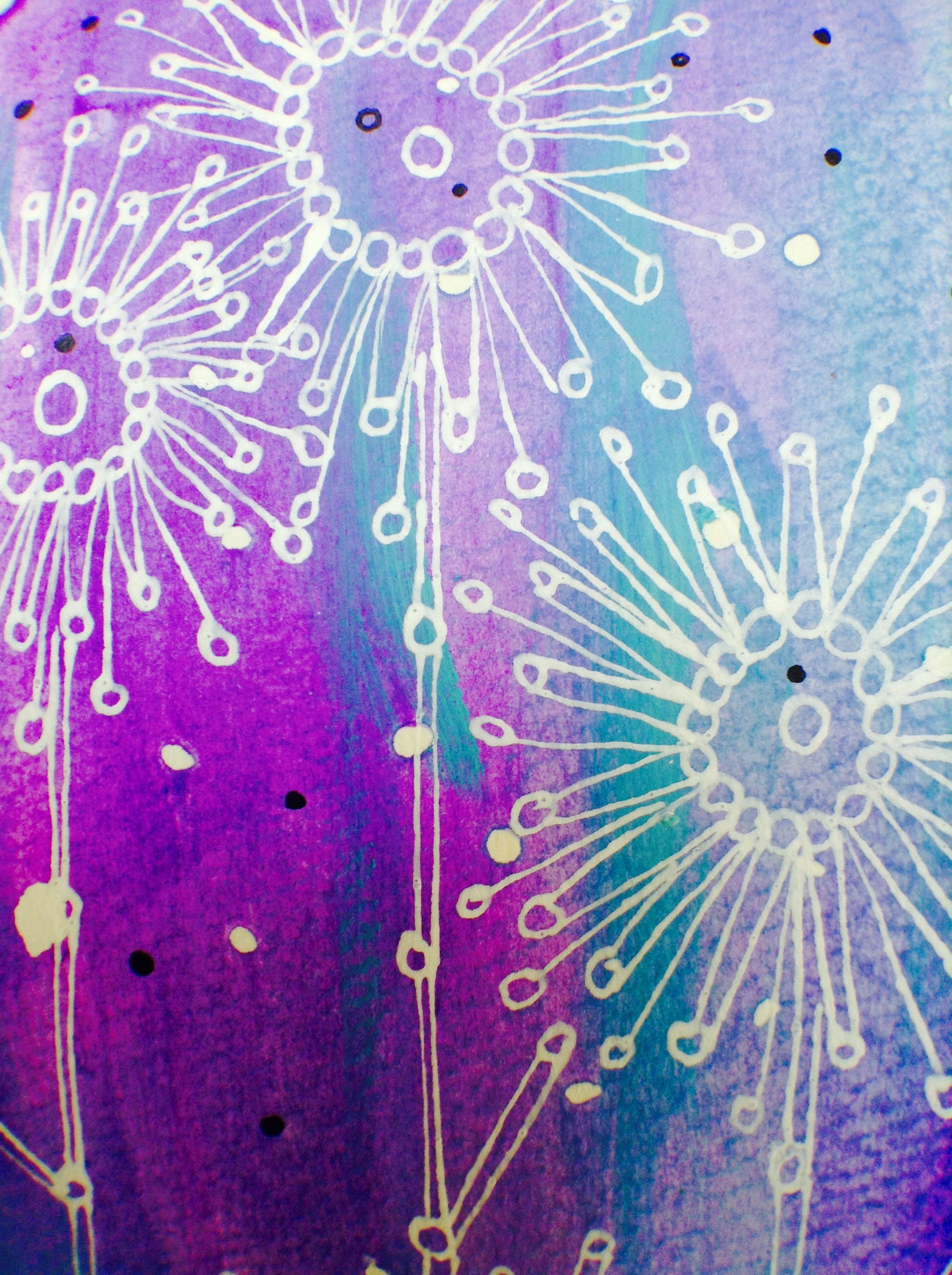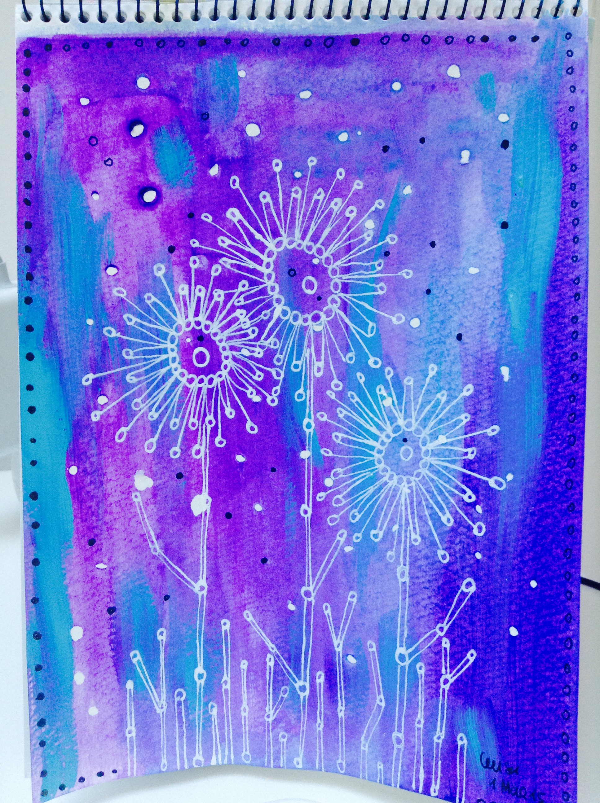 I am working on a piece for Life Book 2015, which includes using gold leaf. I first thought I would skip this lesson, but then watched the video on Saturday and I thought I ma do it.. It was fun. I used double sided adhesive sheet, as I did not have any special glue for gold leaf. This worked perfectly – I cut the circles and stuck them on the page and then removed the other protective foil from he adhesive sheet and put the gold leaf on. How cool is that? I just need to do the flowers around them. I think I will use the same dandelion pattern from the Sunday journal…
